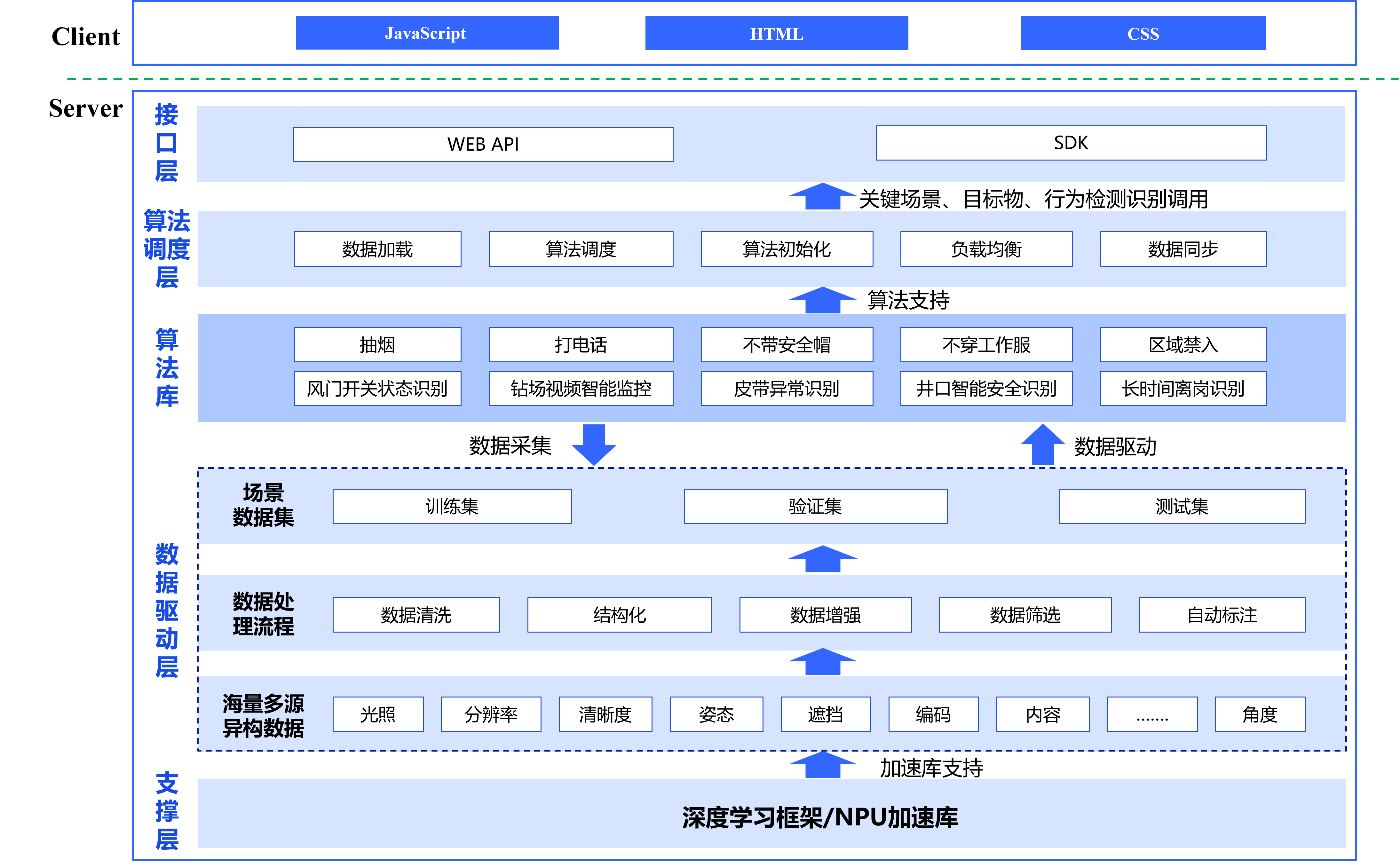 針對(duì)工業(yè)企業(yè)進(jìn)行人員違規(guī)行為、設(shè)備運(yùn)行異常、不安全場(chǎng)景監(jiān)測(cè)的需求,如人員抽煙、打電話、不帶安全帽、不穿工作服、區(qū)域禁入、長(zhǎng)時(shí)間離崗、風(fēng)門開(kāi)關(guān)狀態(tài)監(jiān)測(cè)、皮帶異常監(jiān)測(cè)、井口風(fēng)險(xiǎn)識(shí)別等場(chǎng)景,本方案擬采用流媒體處理技術(shù)、深度學(xué)習(xí)圖像處理技術(shù)、深度學(xué)習(xí)框架構(gòu)建、神經(jīng)網(wǎng)絡(luò)算法建模、參數(shù)優(yōu)化、模型量化、網(wǎng)絡(luò)編程等核心技術(shù)進(jìn)行AI視頻分析系統(tǒng)框架設(shè)計(jì),實(shí)現(xiàn)對(duì)前端視頻流的讀取解析,并采用神經(jīng)網(wǎng)絡(luò)算法模型完成對(duì)視頻圖像中關(guān)鍵場(chǎng)景、行為、目標(biāo)物的檢測(cè)識(shí)別,為業(yè)務(wù)管理提供數(shù)據(jù)反饋。并將檢測(cè)結(jié)果在軟件前端進(jìn)行可視化展示,為業(yè)務(wù)端提供一種可靠的檢測(cè)監(jiān)控手段。為企業(yè)的安全預(yù)防監(jiān)測(cè)及異常事件的管控提供強(qiáng)有力的技術(shù)手段,避免企業(yè)安全事故的發(fā)生及財(cái)產(chǎn)的損失。