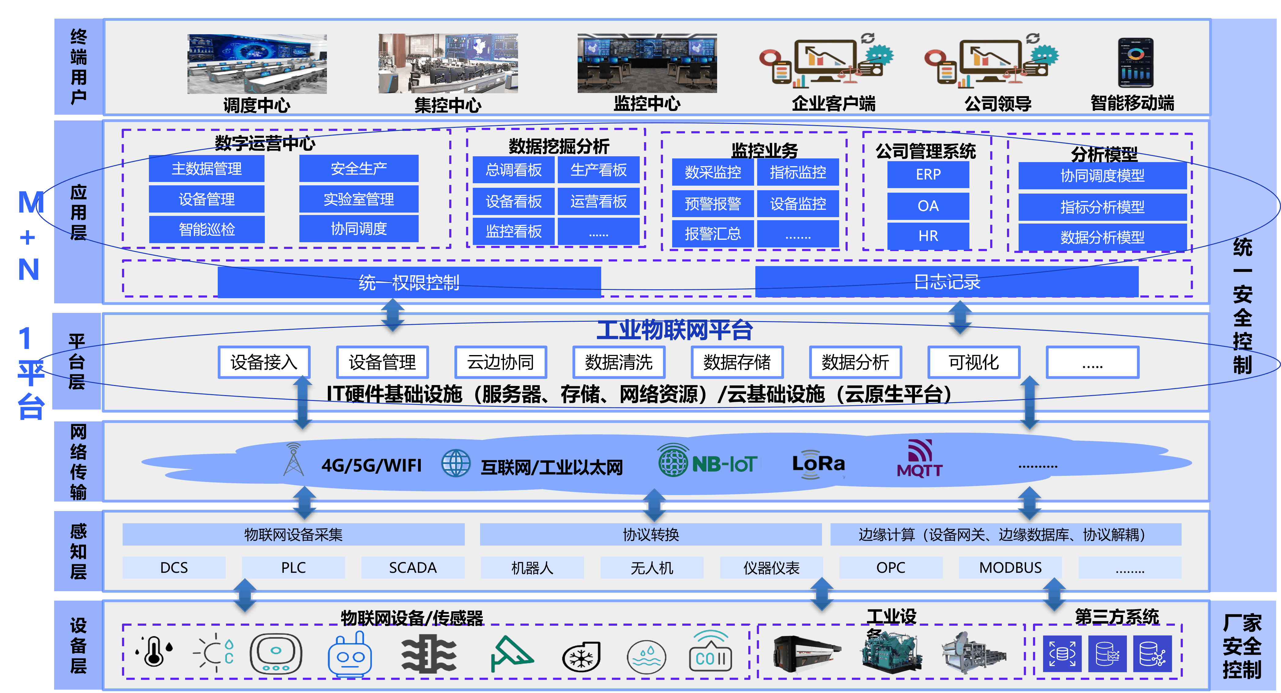 采用基于工業(yè)互聯(lián)網(wǎng)平臺(tái)的云、邊、端架構(gòu),構(gòu)建設(shè)備層、感知層、網(wǎng)絡(luò)傳輸層、平臺(tái)層、應(yīng)用層、分析展示層的6層架構(gòu)模式;形成1個(gè)工業(yè)數(shù)據(jù)平臺(tái)+M個(gè)工業(yè)應(yīng)用系統(tǒng)+N個(gè)算法模型的一體化平臺(tái),依托于底層數(shù)據(jù)構(gòu)建應(yīng)用與算法,充分釋放數(shù)據(jù)的價(jià)值,打造企業(yè)側(cè)集數(shù)據(jù)采集、數(shù)據(jù)管理、業(yè)務(wù)管理、數(shù)據(jù)應(yīng)用、數(shù)據(jù)分析的生產(chǎn)運(yùn)營(yíng)一體化平臺(tái)。參考架構(gòu)如圖。