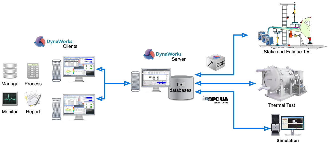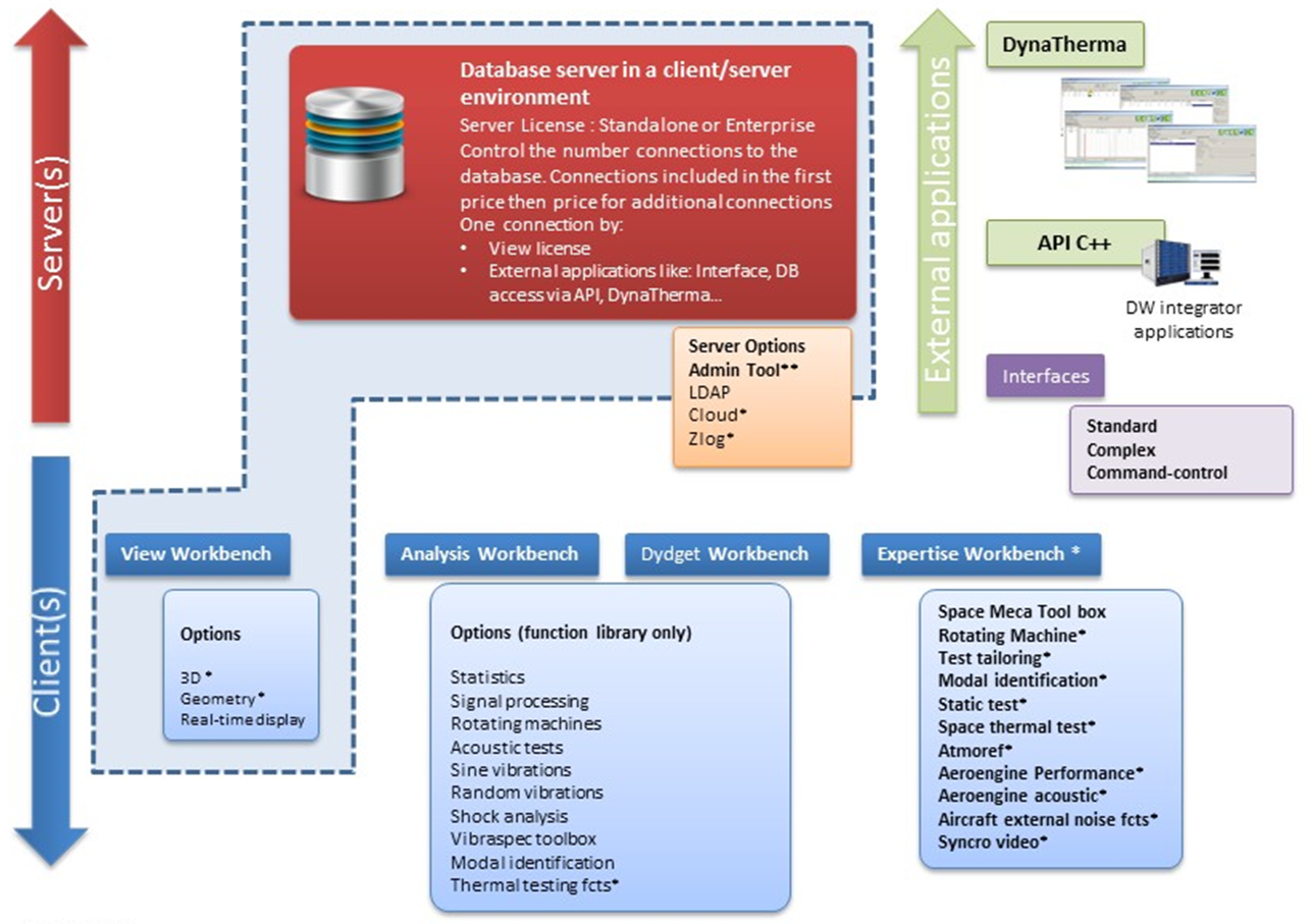 軟件總體采用C/S架構(gòu),即服務(wù)器/客戶端結(jié)構(gòu)。在服務(wù)器端包含DynaWorks 軟件主體和企業(yè)版數(shù)據(jù)庫,以及授權(quán)管理器。DynaWorks 軟件主體包括軟件自身提供的試驗數(shù)據(jù)管理和分析的功能,包含完整的工具箱,有超過400種信號處理過程和方法,以及許多自動化和可定制的工具。企業(yè)版數(shù)據(jù)庫提供數(shù)據(jù)存儲和管理,自身也是一款協(xié)同數(shù)據(jù)庫,可以實現(xiàn)數(shù)據(jù)共享,并有完整的導(dǎo)入/導(dǎo)出工具、易用的自動化和自定制功能。授權(quán)管理器是管理整個DynaWorks 軟件體系所包含的權(quán)限管理工作,包括服務(wù)器和客戶端的License授權(quán)管理。DynaWorks 軟件的總體架構(gòu)如圖: