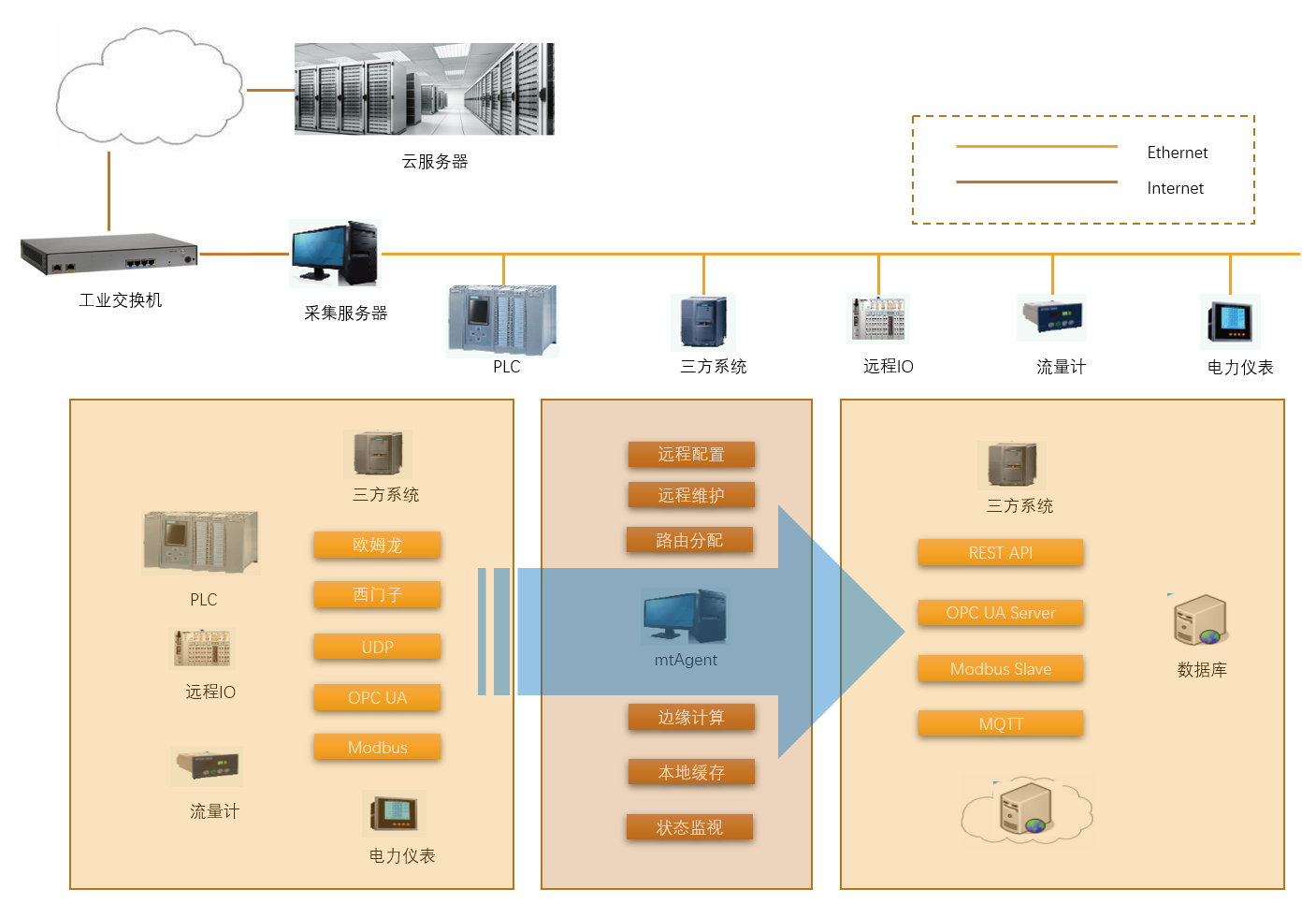 基于服務(wù)器開發(fā),可采集多種設(shè)備和多種協(xié)議的,通過OPC UA與工業(yè)設(shè)備/系統(tǒng)連接,通過MQTT與云端連接。