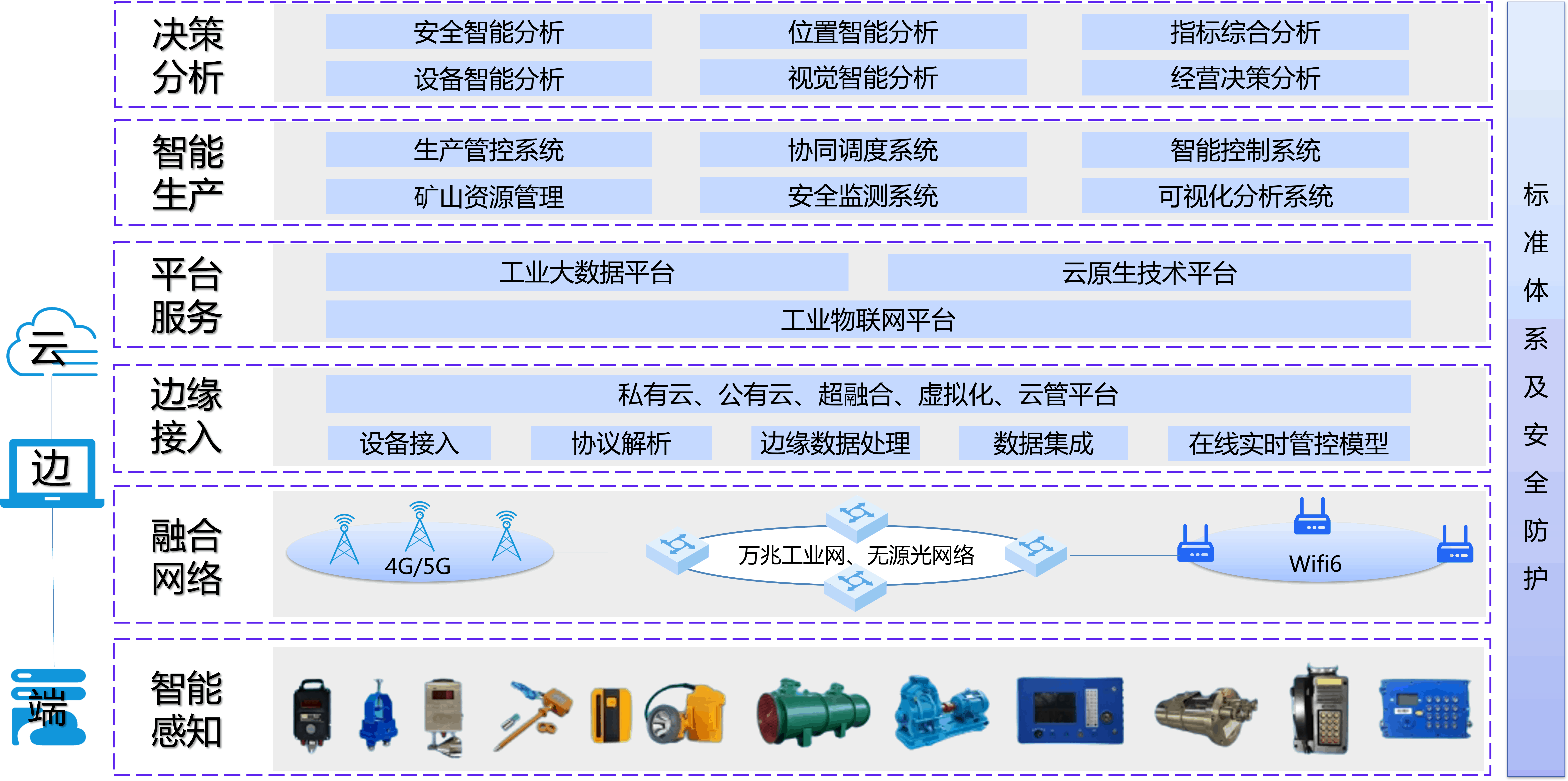 依據(jù)國(guó)家智能礦山建設(shè)指南構(gòu)建智能礦山整體架構(gòu),采用基于工業(yè)互聯(lián)網(wǎng)平臺(tái)的云、邊、端架構(gòu),建立面向“礦石流”的全流程智能生產(chǎn)管控系統(tǒng),將礦山大量基于傳統(tǒng)IT架構(gòu)的信息系統(tǒng)作為工業(yè)互聯(lián)網(wǎng)平臺(tái)的數(shù)據(jù)源,繼續(xù)發(fā)揮系統(tǒng)剩余價(jià)值,同時(shí)逐步推進(jìn)傳統(tǒng)信息化業(yè)務(wù)云化部署,實(shí)現(xiàn)礦山全流程的少人無(wú)人化生產(chǎn),打造以智能感知、融合網(wǎng)絡(luò)、邊緣接入、平臺(tái)服務(wù)、智能生產(chǎn)、決策分析的六層架構(gòu)模式。參考架構(gòu)如下: