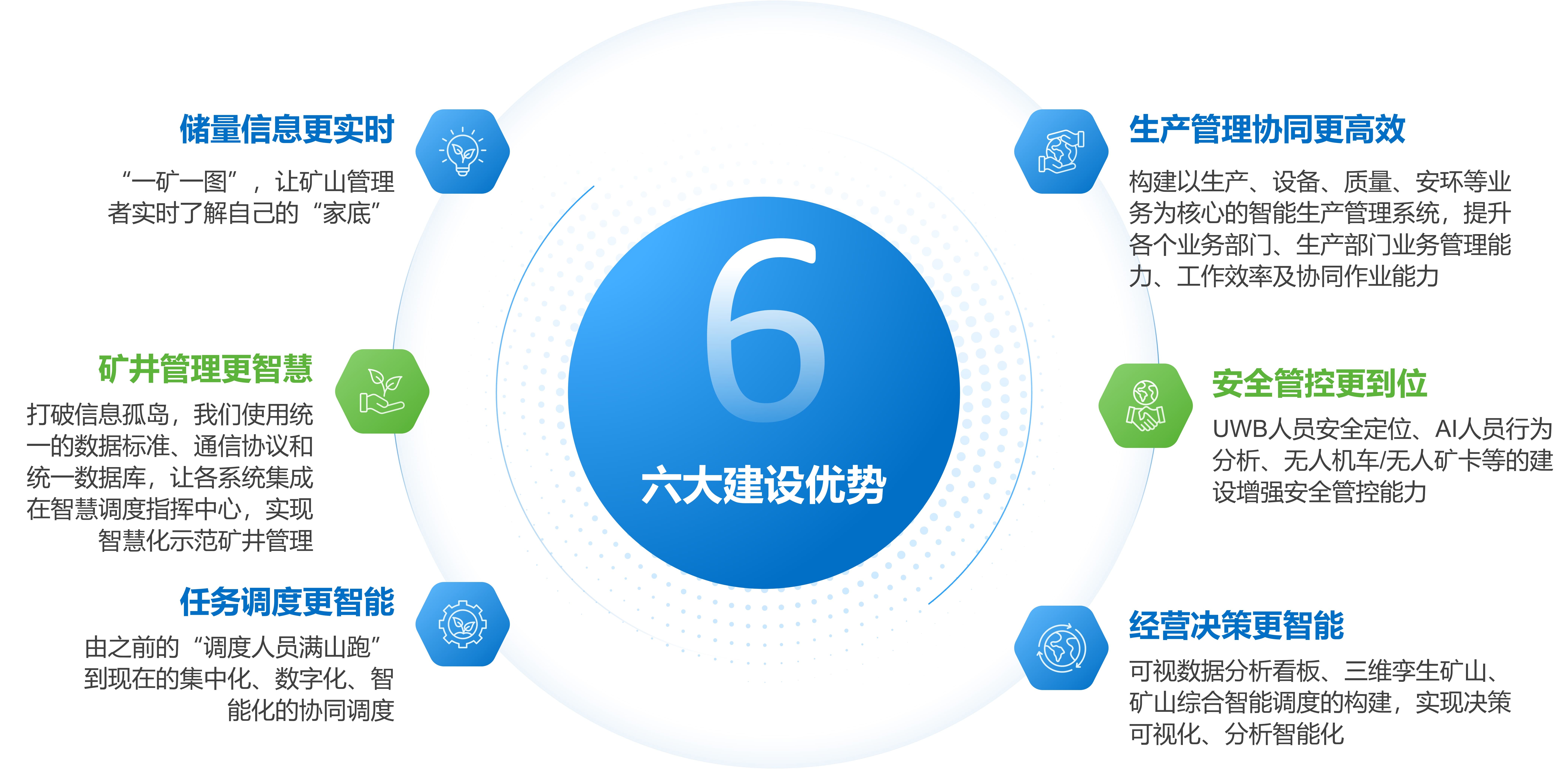 實(shí)現(xiàn)礦山底層數(shù)據(jù)應(yīng)采盡采,減少人工錄入及重復(fù)錄入,充分釋放勞動(dòng)力;構(gòu)建智能化應(yīng)用系統(tǒng)與硬件設(shè)備,提高企業(yè)產(chǎn)品質(zhì)量、生產(chǎn)效率、物流效率,降低人員投入及重復(fù)性工作,實(shí)現(xiàn)礦山企業(yè)本質(zhì)安全與降本增效總體目標(biāo)。