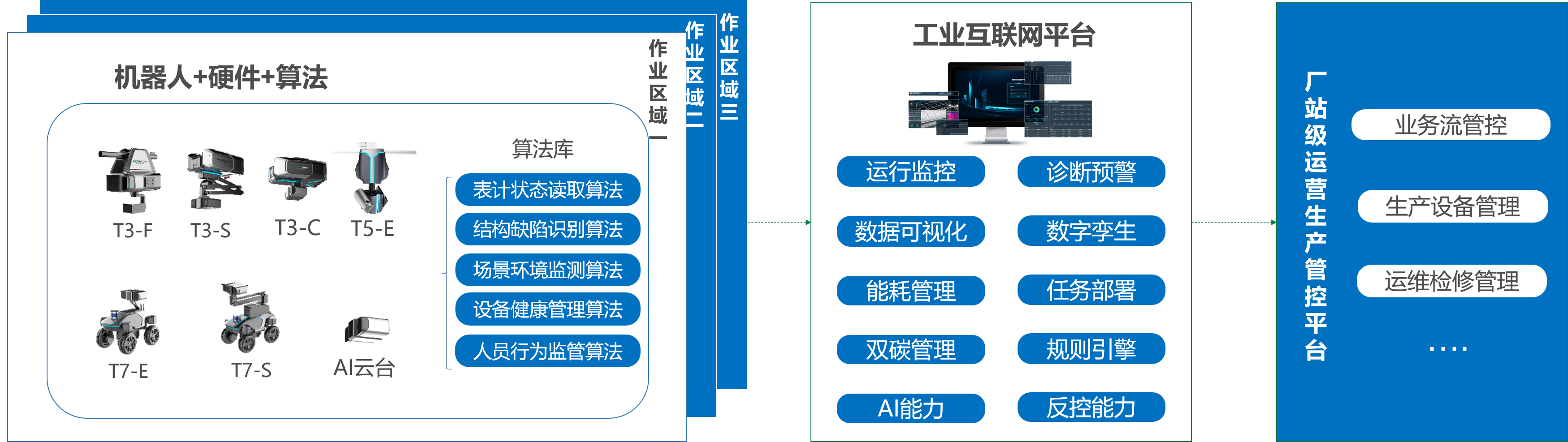 通過融合AI識別算法的智能機器人,能夠?qū)崟r掌控設(shè)備狀態(tài)、環(huán)境信息、人員情況等。同時,通過工業(yè)互聯(lián)網(wǎng)平臺進行數(shù)據(jù)分析、可視化展現(xiàn)。依托平臺側(cè)數(shù)據(jù)的傳輸、分析,支持與廠站級管控平臺系統(tǒng)接入,共享數(shù)據(jù),助力整廠運營一張圖。